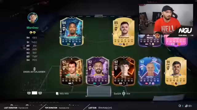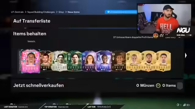 01:47:47Es findet eine Diskussion über den anstehenden Wettbewerbsmodus statt, von dem angenommen wird, dass er schneller sein wird als das aktuelle Spiel. Der Streamer fragt seine Community nach Meinungen über die Möglichkeit, aus einem 10x86 Plus Pack einen Futtie zu ziehen. Nach dem Öffnen des Packs wird ein unverkäuflicher Spieler gezogen, was zu Enttäuschung führt. Ein Highlight ist der Zufallsgewinn eines 93er Hütten, der innerhalb weniger Stunden von 3,7 Millionen auf 200.000 Credits einbricht.