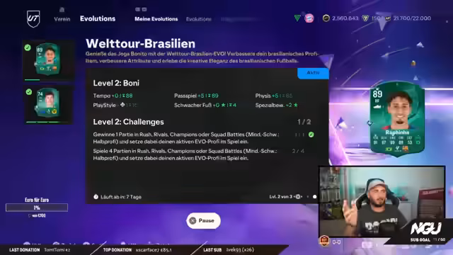 08:53:03Beim FIFA-Spiel erklärt der Streamer das Konzept der Evolution von Spielerkarten. Er zeigt, wie er Gerard Werder durch Siege in Spielen evolutionieren lassen möchte, um ihn in eine Rising Star Evo zu bringen. Er erläutert, dass die evolutionierten Spieler nicht zwingend von Anfang an spielen müssen, sondern als Einwechselspieler genutzt werden können. Auch diskutiert er die potenziellen Stärken und Schwächen der verschiedenen Evolutionsmöglichkeiten und wie diese sich auf die Spielweise auswirken könnten. Die Zuschauer sind gespannt auf die Entwicklung ihrer favorisierten Spieler.