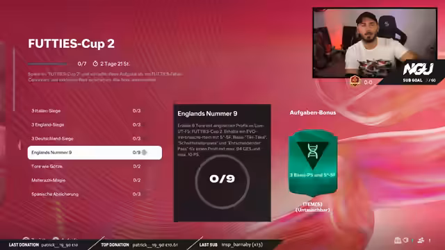 01:50:51Der Stream konzentriert sich auf den aktuellen Cup, bei dem neun Tore mit englischen Spielern erzielt werden müssen. Zuerst wird die Aufstellung mit Barnes außen und Leao in der Mitte diskutiert, da Barnes bessere Tore schießen kann. Die Taktik wechselt zwischen einer engen Raute und einer 4-2-2-2 Formation je nach Spielverlauf. Der Fokus liegt eindeutig auf der Erreichung der Evo für die Spieler, während der Sieg im Cup weniger im Vordergrund steht.