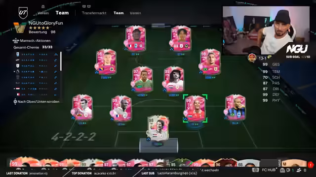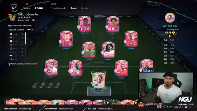 02:20:00Im LiveStream zeigt der Streamer sein aktuelles Team, das hauptsächlich aus 99er Evos besteht. Er experimentiert mit der Aufteilung der Playstyles für seine Spieler, um deren Potenzial zu maximieren und optimale Kombinationen zu finden. Für die Rivals-Spiele und die Weekend-League-Qualifikation setzt er auf seine vertraute 4-2-2-2-Formation. Seine Strategie im Spiel ist aggressiv und nutzt gezielt Schwächen der Gegner, wie fehlende Verteidigung, aus, um erfolgreich zu sein und sich frühzeitig für die Weekend League zu qualifizieren.