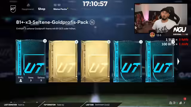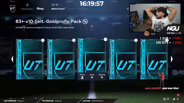 01:20:01Nach diversen Abschweifungen startet der Streamer mit einem Pack-Opening und initiiert interaktive Wetten mit dem Chat. Die erste Wette dreht sich um die Anzahl der benötigten kleinen Pack, um den ersten Walkout zu ziehen. Der Streamer testet verschiedene Packgrößen, von Goldpacks bis hin zu Premium-Goldpacks, und versucht, das Glück des Chats mit seinen Zügen zu spiegeln, wobei die ersten Versuche ohne nennenswerte Erfolge bleiben.