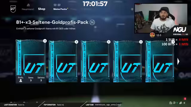 01:41:39Nach einer Serie von erfolglosen Pack-Openings, bei der ausschließlich Informs und keine Walkouts gezogen werden, zeigt sich der Streamer zunehmend frustriert und verärgert. Er betont seinen Einsatz und sein Leidenschaft als Grinder, die sich nicht in hochwertigen Karten niederschlägt, und äußert seinen starken Wunsch, endlich einen 'Packlack' zu ziehen, was das Gefühl ist, eine extrem wertvolle Karte zu ziehen.