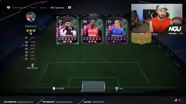00:12:58Der Stream startet mit der Begrüßung der Zuschauer und dem Bestätigen des laufenden Streams. Nach der Einleitung wird der Fokus des Streams vorgestellt: Es sollen heute ausschließlich große Packs geöffnet werden, um hochwertige Spieler zu ziehen. Neben dem Gameplay werden auch die neuen Shape-Shifter-Spieler und ihre Evolutionsmöglichkeiten behandelt, da der Streamer besonders neugierig auf den hochbewerteten Spieler Ronaldinho ist.