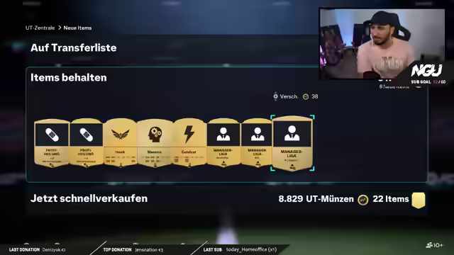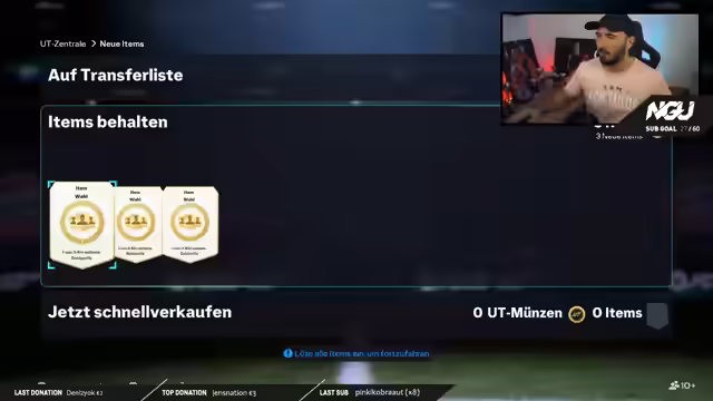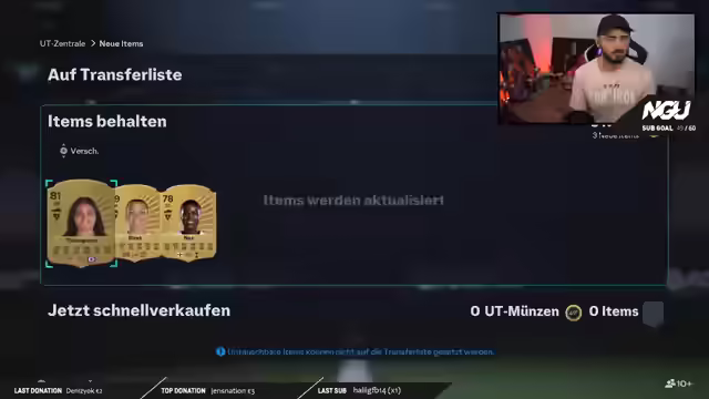 01:44:45Der Streamer spricht über seine Tutorials und kündigt das Zick-Zack-Dribbling-Tutorial an. Er betont, dass seine Videos darauf abzielen, den Zuschauern zu helfen, besser zu werden. Er öffnet weitere Packs, die jedoch keine guten Ergebnisse bringen. Es wird über Probleme bei Ecken gesprochen. Der Streamer öffnet ein Team of the Week Profi Pack und zieht eine Frau, die ihn auslacht. Er hofft auf mehr Packluck auf dem RTG-Account. Er wechselt zum RTG-Account, da die Rewards auf dem Main-Account schlecht waren. Er zeigt seine Division 3 Rewards, die enttäuschend sind. Er freut sich über die erreichten 55 Subs und kündigt einen 12-Stunden-Bomber-Stream bei 150 Subs an.