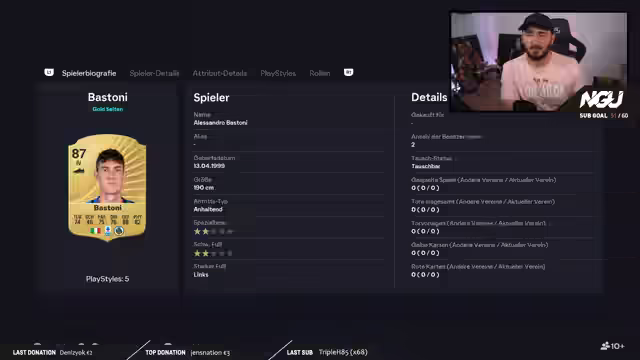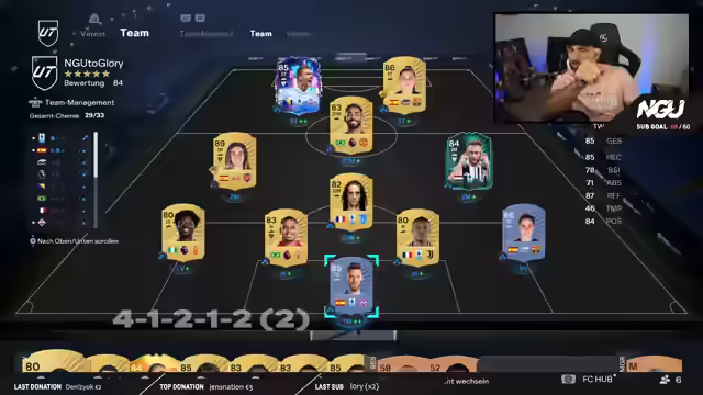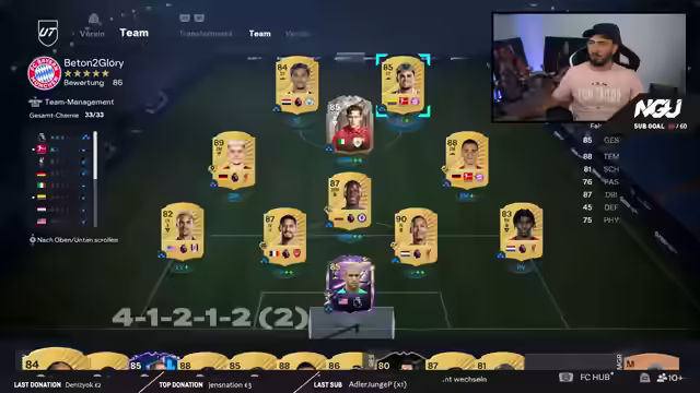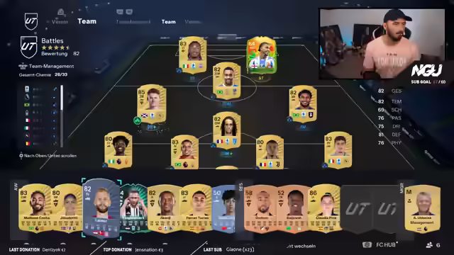 04:38:38Das Gameplay hat sich nicht stark verändert, es ist dem vorherigen sehr ähnlich, möglicherweise sogar verbessert. Es wird empfohlen, die Insta- und Facebook-Stories anzusehen, da dort viele Tipps und Tricks sowie Unterhaltung geboten werden. Die Dragbags wurden bereits vor Tagen in der Insta-Story gezeigt. Es werden alle Erkenntnisse geteilt, um gemeinsam besser zu werden. Draft wird als langweilig empfunden. Die Höhe wird auf 60 gespielt, was ein guter Wert zwischen ausgeglichen und hoch ist. Das Team of the Week Pack wird geöffnet, in der Hoffnung auf gute Karten. Es wird zum anderen Account gewechselt, um mit Musiala zu spielen. Das Team wird auf Chemie gebracht. Varela hat nicht überzeugt, Cobainers ist offensiv stärker. Es wird überlegt, wie das Team am besten aufgestellt wird, insbesondere wo Totti spielen soll. Musiala soll auf Halbflügel spielen. Marmusch soll getestet werden. Es wird auf Toilette gegangen und sich für den geilen Stream bedankt. Es wird sich bei den Mods für den Support bedankt. Es wird in den Cup gegangen und alles rasiert. Es wird sich bei allen für Donations, Subs und Bits bedankt. Wer Amazon Prime nutzt, kann kostenlos abonnieren und Vorteile freischalten. Die Spieler werden eingekauft und der Code wird gezeigt. Es werden Chemistry Styles vergeben. Kryzen wird bald zurückkehren. Es wird sich über 450 Likes gefreut. Es wird gefragt, ob man rein soll und das Team wird als böse bezeichnet. Es wird überlegt, zur Halbzeit den Spieß umzudrehen und die beiden falschen 9er zu tauschen. Das Gameplay wird als viel besser als FC 25 empfunden und es wird noch viel mehr Potenzial gesehen.