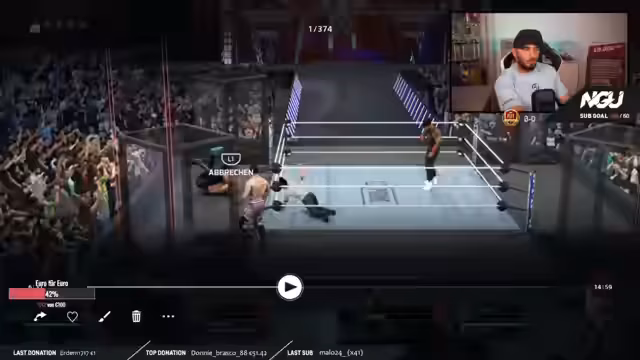 09:11:42Der Stream beginnt mit einem hochintensiven Gauntlet-Match, bei dem der Streamer gegen verschiedene Charakter wie Bobo, Bergio und Maurice antritt. Es kommt zu einem extrem langen und dramatischen Kampf, der sich über fast 50 Minuten erstreckt. Die Spannung wird durch ein spezielles Pin-System erhöht, bei dem Wrestler erst beim zweiten Versuch aus einem Pin ausbrechen dürfen. Besonders auffällig ist die enorme Ausdauer und Widerstandsfähigkeit von Bergio, der mehrfach scheinend besiegt wird, aber immer wieder kontert und das Match aufrechterhält.
