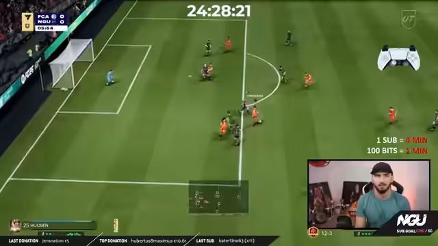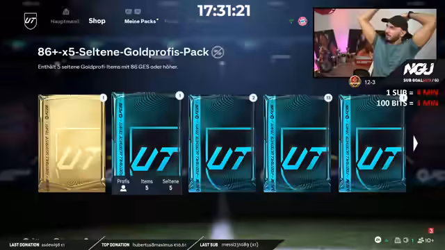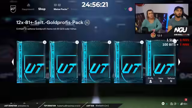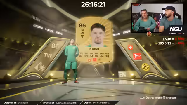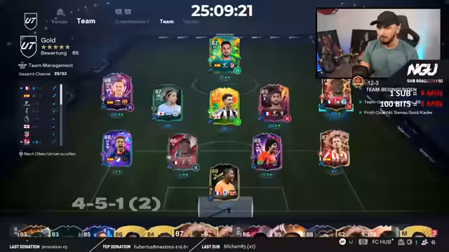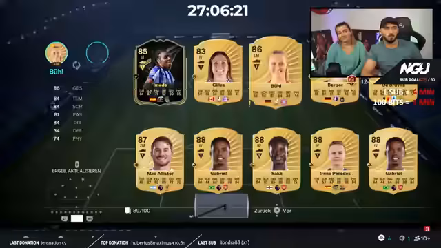 03:24:51Der Stream wird durch eine wachsende Anzahl an Spenden, insbesondere durch Gift-Subs und Bits, vorangetrieben. Die Uhr schnell kontinuierlich nach oben, was als Zeichen für den hohen Engagement des Publikums gewertet wird. Gleichzeitig wird das pack-opening fortgesetzt, wobei viele Walkouts, also seltene Karten, gezogen werden. Der Fokus bleibt auf dem Erhalt eines Marcelo-Karten für den Hauptaccount, wobei die Strategie zur Verwaltung des Speichers und zur Auswahl der richtigen Spieler beibehalten wird. Die Energie im Chat ist hoch.
