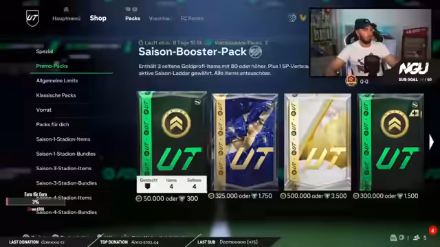 00:52:37Der Streamer startet den nächsten Abschnitt mit dem Öffnen von Packs und überlegt sich verschiedene Wettstrategien für die Zuschauer. Er möchte keine Wette pro Pack machen, sondern eher Wetten basierend auf bestimmten Kriterien wie Spielerwert oder Geschlecht des Spielers. Es wird entschieden, eine Wette darauf abzuschließen, ob der erste Walkout ein Mann oder eine Frau sein wird, wobei Walkouts ab 86 bewertet werden. Die Regeln für Doppelwalkouts werden erklärt. Der Streamer beantwortet Fragen zu Headset-Marken und Stream-Qualität und erklärt, dass er eventuell zukünftig ein Headset verwenden wird. Er teilt seine bisherigen Erfahrungen mit Headsets und die damit verbundenen Herausforderungen. Das erste Team of the Week Pack wird geöffnet, und der erste Walkout ist eine Frau, Vanessa Gilles, was bedeutet, dass die Zuschauer, die auf eine Frau gesetzt haben, gewinnen. Der Streamer öffnet weitere Packs, aber es erscheint keine blaue TOTY Karte.