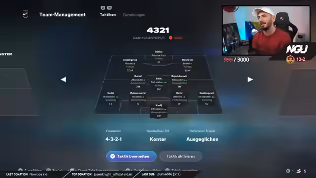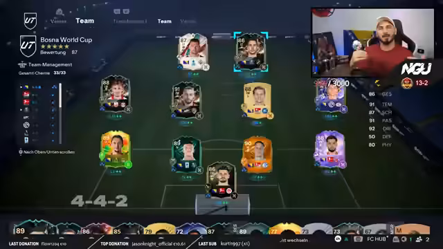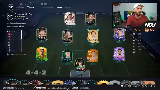 01:13:08Der Streamer analysiert sein EAFC-Team Bosna Squad und stellt fest, dass es sich stark weiterentwickelt hat. Besonders die Spieler Besirovic und Burnic haben sehr gut abgeschnitten und ihm Siege gebracht. Er plant, mit diesem Team in Rivals zwei Siege zu holen, um sich für die Weekend League zu qualifizieren. Er testet dabei verschiedene Formationen wie das 4-3-2-1 und findet diese sehr effektiv. Er erwähnt auch, dass er auf weitere Evolutionen für bestimmte Spieler wartet, um das Team noch stärker zu machen.