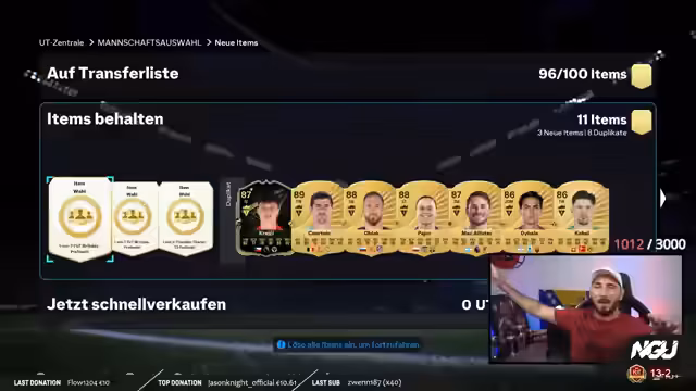 00:41:50Der Streamer kündigt ein großes Pack-Opening für den nächsten Tag an, bei dem er Team of the Season-Packs öffnen wird. Er hat bereits 40 Packs vorbereitet, darunter verschiedene seltene Karten. Da er am Wochenende nach Hamburg fliegt, um an der VBL-Finale teilzunehmen, ist der genaue Startpunkt noch unklar - es könnte 18 Uhr oder auch erst 19.30 Uhr werden. Er verspricht, auf Social Media über den genauen Zeitpunkt zu informieren. Er plant, nach dem Stream noch ein Rivals-Match mit seinem Bosna Squad zu bestreiten, um sich für die Weekend League zu qualifizieren.