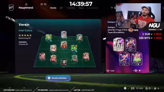 00:10:17Der Stream begrüßt die Zuschauer zum 34. Tag des NGU-Subathons, der seit 12 Stunden und 37 Minuten läuft. Der Streamer äußert die Möglichkeit, dass am 6. Januar das Finale des Events stattfinden könnte. Der Hauptfokus des heutigen Streams liegt auf der Teilnahme an der FUT Champions mit einem speziellen Team, dem sogenannten RTG-Account, bei dem Khaled mit fünf Sternen Skills debütieren wird.