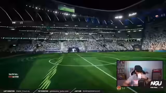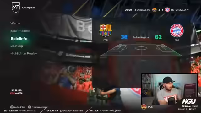 03:46:49Zurück im FIFA-Modus berichtet der Streamer von seinem anhaltenden Erfolg. Nach mehreren Siegen steht er bei 9:0 in der Weekend League und spielt nun gegen einen Gegner mit einem anspruchsvollen Team. Er lobt bestimmte Spieler wie Chouameni und Rodri, die in seiner Formation eine exzellente Leistung erbringen. Obwohl er torgefährlich agiert, muss er auch starke Verteidigungsleistungen des Gegners und glückliche Paraden des Torwarts anerkennen, was die Partie bis zum Ende spannend hält.
