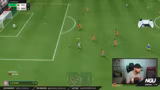 00:29:09Während des Spielverlaufs analysiert Mirza wiederholt Probleme mit dem Gameplay. Er beobachtet, dass Gegner durch künstliche Intelligenz unterstützt werden, die ihnen im 1-1-Duell einen unfairen Geschwindigkeitsvorteil verschafft. Dadurch können auch fehlerhafte Verteidigungsaktionen der Gegner noch zu Toren führen. Er beschreibt, wie er den Gegner spielerisch zerpflückt, aber trotzdem durch solche CPU-Rettungenpunkte punkten muss.