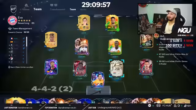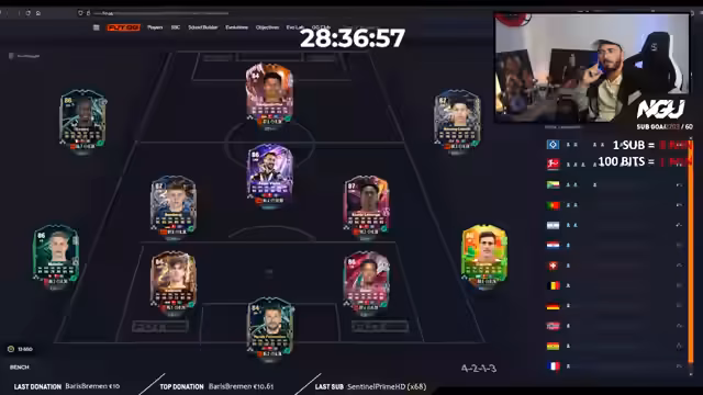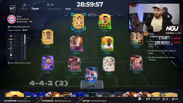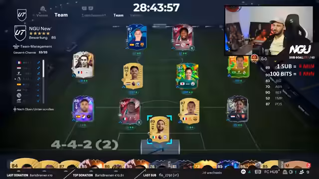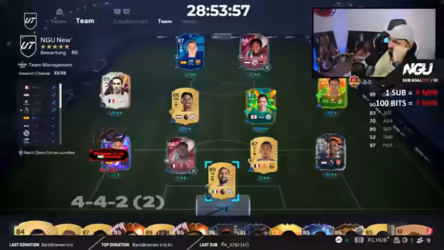 04:21:15Die Community wird aufgefordert, ihre FIFA-Teams über Squad Builder auf footbin.com oder foot.gg zu erstellen und den Link via Twitch-Flüsternachricht zu senden. Der Streamer erklärt, dass die Teams für das bevorstehende Winter Wildcards-Event optimiert werden sollen, und gibt individuelle Feedback-Runden, wie bei McBurns Team mit Nunes und Macarena, das als experimentell bewertet wird. Zudem werden bereits gesammelte Packs für das morgige Pack-Opening angekündigt.