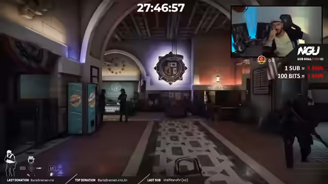 06:25:12Die Spieler analysieren ihre Vorgehensweise bei der aktuellen Mission, bei der sie Panikräume sichern und Zivilisten retten müssen. Es gibt intensive Diskussionen über effektive Taktiken wie den Einsatz von Blendgranaten und nicht-tödlichen Waffen. Gleichzeitig werden mögliche zukünftige Kooperationen wie Battlefield-Sessions oder Filmeinspieler (Jason Statham's "Chaos") thematisiert. Der Fortschritt der Mission gestaltet sich aufgrund der weitläufigen Levelstruktur herausfordernd.