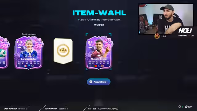 04:13:45Nach der emotionalen Niederlage packt der Streamer durch, um die zu erwartenden Belohnungen aus der Weekend League zu ziehen. Er startet mit den 14:1 Rewards, aus denen er untradable Spieler wie Baldé und Braga zieht. Trotz des enttäuschenden Ergebnisses versucht er, die Stimmung zu heben und betont, dass die 'tradable' Packs im Shop die wirklich wertvollen Belohnungen sind, von denen man gute Spieler ziehen kann. Die Ziehung der Packs dient als Trost und Abschluss für den Stream.