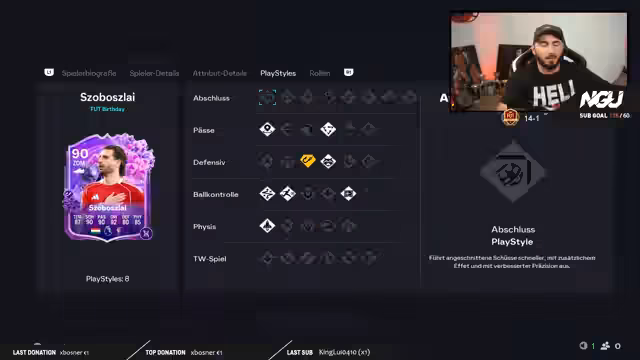05:26:34Der Streamer plant, in die Weekend League einzusteigen und stellt seine aktuelle Teamzusammenstellung vor. Er hat vor, den gezogenen Spieler Spossomslay auf der Position ATG einzusetzen und diskutiert intensiv über dessen optimale Playstyles. Überlegungen reichen von Anchor für die Verteidigung bis hin zu Technical Plus fürs Dribbling. Parallel wird der Spieler Leao als extrem starkes Flügelmaß angesehen, dessen Spielstil mit Artist deutlich verbessert wurde und der als Flügelflitzer das Gesamtpaket darstellt.