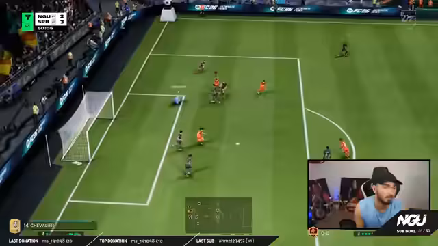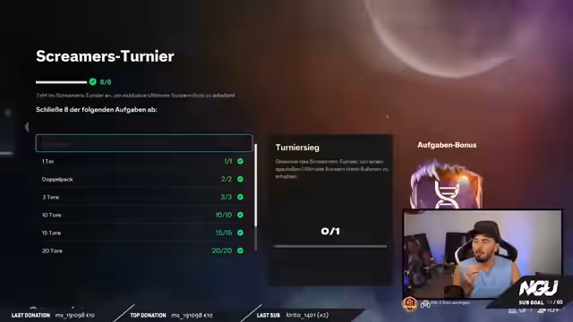 00:40:38Der Streamer beginnt mit dem Screamers Turnier und berichtet von den Schwierigkeiten bei der Erzielung der geforderten Tore, insbesondere des Distanztores. Er beschreibt, wie die CPU aggressiv spielt und sein Spielstil durch Bunkern des Gegners behindert wird. Nach anfänglichen Rückschlägen, darunter verpasste Chancen und drei Lattentreffer, ändert er seine Strategie, indem er dem Gegner Tore gönnt, um die Aufgaben effizienter zu erledigen und seine eigenen Missionen zu erfüllen.