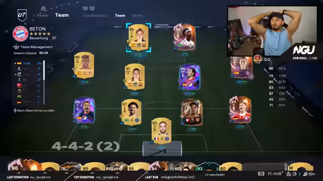 03:08:38Im Stream wird tiefgehend über die individuellen Stärken der Spieler in der 4-4-2-Formation gesprochen. Baena wird als fast unaufhaltsam mit dem stärksten R1-Dribbling im Spiel gepriesen, das es erlaubt, in nur wenigen Schritten an Gegnern vorbeizuziehen und Räume zu öffnen. Im Gegensatz dazu werden Spieler wie Cherki und Bouteas als kritisch gesehen; Cherki wird als nervig und unzuverlässig beschrieben, während Bouteas im zentralen Mittelfeld als 'unsichtbar' und wirkungslos eingestuft wird, da er nicht in das System passt und kaum Einfluss auf das Spiel nehmen kann. Spieler mit Playstyles wie Tiki-Taka werden als essentiell für einen erfolgreichen Aufbau angesehen, während deren Fehlen das Spiel massiv erschwert.