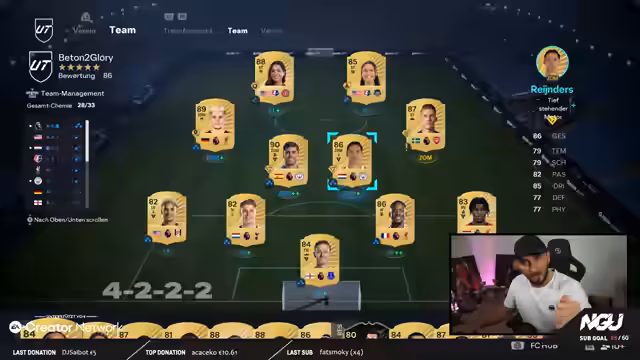 00:07:07Der Stream beginnt mit einem herzlichen Willkommen der Community. Der Streamer kündigt an, dass es sich um den zweiten FC 26 Stream handelt und dieser vollkommen dem Gameplay gewidmet sein wird. Statt Packs zu öffnen, soll intensiv in Division Rivals gegrindet werden, um das Spiel weiter kennenzulernen. Die Taktik von FC 25 wurde zunächst übernommen, aber der Streamer hat bereits experimentiert und eine neue, defensiv orientierte Formation getestet, die aus seiner Sicht bessere Ergebnisse erzielt. Er fordert die Zuschauer auf, ihre erste Eindrucksbewertung für das Gameplay von 1 bis 10 abzugeben und betont, dass das Spiel sich trotz Bekanntem von FC 25 deutlich unterscheidet, insbesondere in der Defensive und Offensive.
