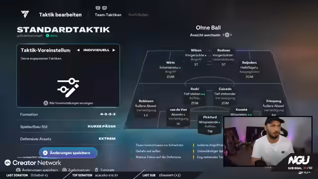 00:18:17Im weiteren Verlauf stellt der Streamer die neue Taktik, ein 4-2-3-1, im Detail vor. Er erläutert die spezifischen Spieleranweisungen, wie zum Beispiel die tiefstehenden Motor-Verteidigung der beiden Zentraldefensivmitglieder und die defensive Ausrichtung der Außenverteidiger. Diese Taktik ist auf Konter ausgelegt und soll eine kompakte Defensive sicherstellen. Gleichzeitig bewertet er seine aktuelle Spielerwahl. Spieler wie Konaté, Wirz und Pina werden als extrem stark gelobt, insbesondere Wirz wird als Investition hervorgehoben, die sich bereits auszahlt. Pina wird für den RTG-Account als unverzichtbar angesehen, während Sophia und Rodman im aktuellen Team eine exzellente Leistung zeigen.