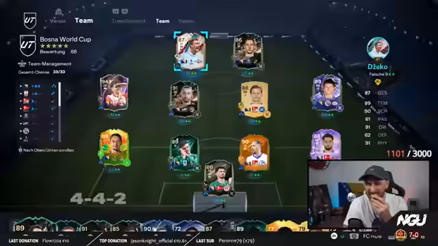 03:44:14Der Streamer trifft auf zwei sehr starke Gegner, die 14-15 Punkte erreicht haben und professionelles FIFA-Spiel mit konsequenten Kontern und Präzisionsschüssen zeigen. Er wechselt auf die 4-3-2-1 Formation um, da die 4-4-2 gegen diese Gegner nicht effektiv ist. Er erkennt die Stärken der Formation, insbesondere die hohe Durchschlagskraft im Mittelfeld, aber auch die Risiken bei zu schnellem Spiel.
