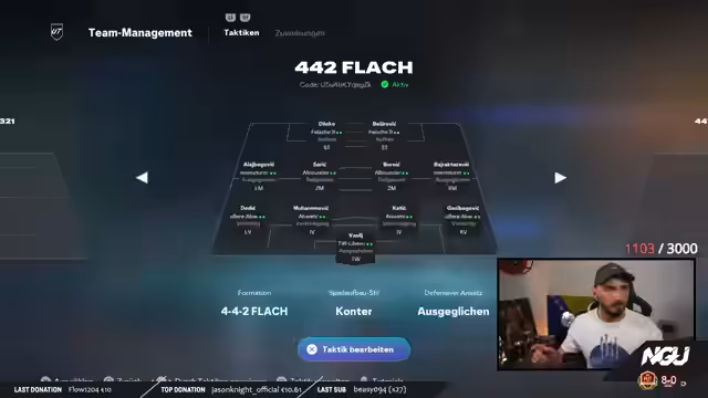 03:19:55Der Streamer stellt zwei FIFA-Taktiken vor, eine 4-4-2-Formation, mit der er bereits 15-0 Siege erzielt hat, und eine alternative 4-3-2-1 Formation. Bei der 4-4-2-Formation konzentriert er sich auf Konter und eine defensive Tiefe von 55. Die 4-3-2-1 Formation bietet mehr Ballbesitz und Offensivpotenzial, erfordert aber Konzentration im Spielaufbau, um Fehlpässe zu vermeiden. Er plant, beide Taktiken in der Weekend League weiter zu testen.