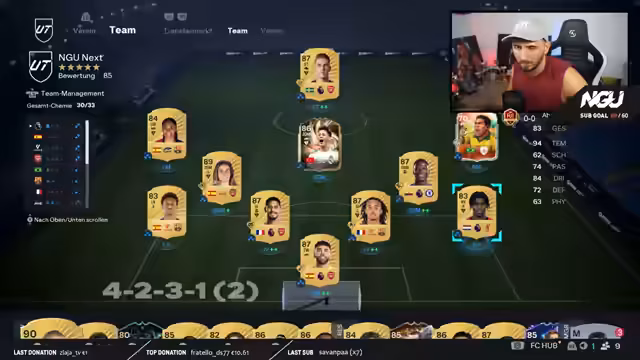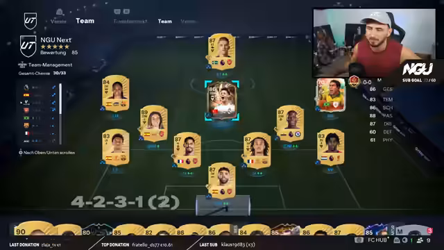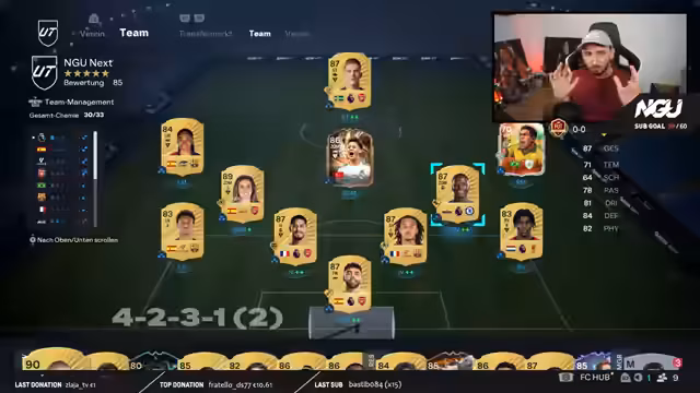 05:05:29Ein weiteres Team mit dem Nickname 'Style' wird vorgestellt, das laut Streamer Ultimate Team wortwörtlich genommen hat und daher eine katastrophale Chemie von nur 14 von 33 aufweist. Die Defensive mit Tomori als Serie-A-Spieler in einer La-Liga-Mannschaft wird kritisiert. Es werden mehrere Lösungsvarianten für eine bessere Chemie vorgeschlagen, darunter der Einsatz von Leimer, Kimmich oder Musiala auf verschiedenen Positionen.