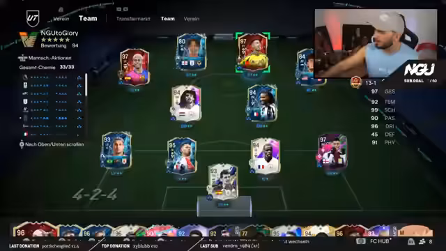 05:20:48Der Glücksstrahl setzt sich fort. Das erste offizielle Pack nach Dembélé bringt einen 97er Lukaku, gefolgt von einem weiteren starken Spieler. Beim letzten Pack trifft es den Streamer wieder, als er einen 95er Okocha ziehen kann. Die Stimmung ist euphorisch, und das gezogene Team als Ganzes wird als unglaublich stark und potenzialreich angesehen.