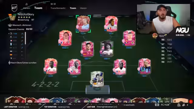 00:18:03Der Streamer bestätigt, dass er in den letzten Monaten ein deutlich gestiegenes spielerisches Niveau bewiesen hat, welches durch die konstanten Platzierungen und das erneute 15-0 gestützt wird. Für den aktuellen Stream stellt er ein komplett neues Team vor. Der Fokus liegt auf Edin Dzeko, der als ZOM startet, und Griezmann, der auf der linken Seite spielt. Havertz ist evolviert und wird getestet, während die Abwehr mit Viera und Turam als Monsterabwehr fungieren soll.