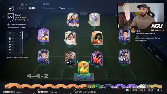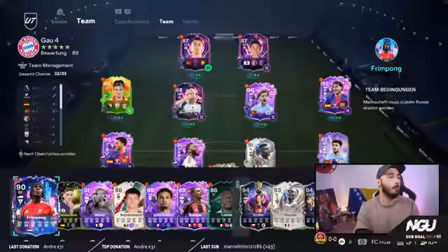 02:56:05Der Streamer baut vier Teams für das Gauntlet-Event auf, um mehr Pack-Belohnungen zu erhalten. Dabei werden verschiedene Kombinationen ausgetestet, um die bestmögliche Chemie und Ausgewogenheit zu finden. Spieler wie Bernardo Silva und Lamin werden gezielt eingebaut, während gleichzeitig auf eine gute Offensive und Defensive geachtet wird. Das Ziel ist es, ein starkes Aufgebot für alle Runden zu haben und eventuelle Schwächen zu kompensieren.