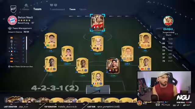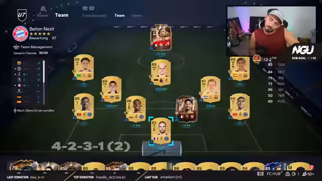 03:00:55Der Streamer analysiert seine Taktik im Spiel und experimentiert mit dem Wechsel von einem 4-2-3-1 auf ein 4-4-2-System. Er ist der Überzeugung, dass das 4-4-2-System ihm mehr Sicherheit und bessere Ergebnisse, insbesondere gegen stärkere Gegner, bietet. Eine direkte Änderung während der Weekend League schließt er jedoch aus, da er derzeit eine positive Bilanz hält und nicht unnötig Risiken eingehen möchte. Der Fokus liegt darauf, die neue Formation in der Woche zu trainieren, um sie dann gezielter einsetzen zu können.