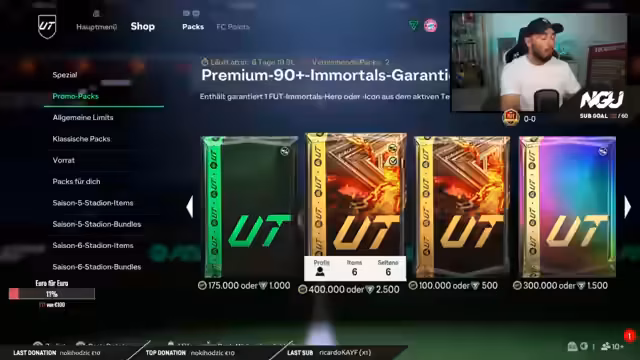 Beim Öffnen von Immortals-Packs wurde die begehrte R9-Karte gezogen, was zu Diskussionen über einen möglichen Bug im Spiel führte. Im weiteren Verlauf des Pack-Openings wurde auf zwei Kontinuen gespielt. Mit dabei waren auch Wetten, in denen erfolgreich auf das Erscheinen von Icons und auf Walkouts getippt wurde. Der Höhepunkt bildeten zwei Premium-Immortals-Packs, die trotz hoher Erwartungen keine Spitzen-Icons brachten.