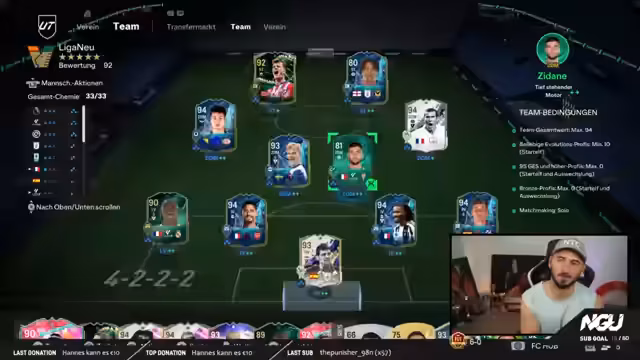 01:50:11Der Streamer teilt den aktuellen Stand in der Evo-Elite-Liga mit und gibt Einblicke in seine Taktikwahl. Er empfiehlt seine bevorzugte 4222-Formation als absolute Lieblingsstrategie und rät der Community, Player-individuell zu denken, da jeder Spieler auf einer Position anders agiert. Er betont, dass man nicht 1 zu 1 Spieler switchen kann und stattdessen experimentieren muss. Zudem gibt er Tipps zum Fördern von Videos und Tutorials für die Community, um gemeinsam den Erfolg zu steigern.