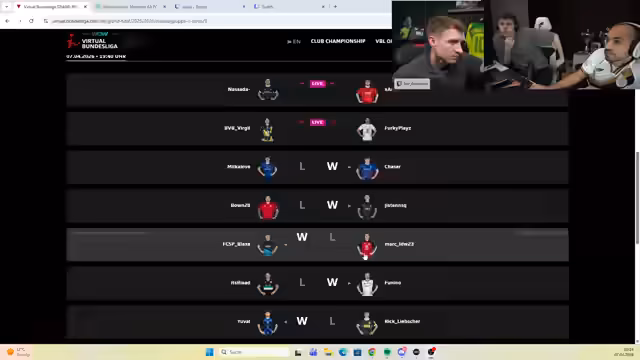 00:33:20Während die meisten Spiele frühzeitig entschieden sind, gibt es in anderen Begegnungen packende Entwicklungen. Das zwischen Riyad (Hannover 96) und Blake (FC St. Pauli) endet nach einer spannenden Partie in der Verlängerung mit 8:7 für Riyad. Dieser Sieg gilt als eine der ersten großen Überraschungen, da es sich um ein Duell zweier Spieler handelt, die sich über die VBL Open qualifiziert haben.