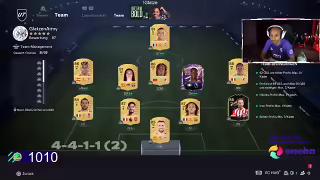 00:09:31Es wird die Frage beantwortet, wann man einen Spieler verkaufen sollte, wobei geraten wird, ihn zu behalten, wenn man ihn spielen möchte, oder ihn nächste Woche zu verkaufen, wenn nicht. Der Streamer erwähnt, dass er einen Fake Account hat, um von E-Sportlern selektiert zu werden und seinen Namen geändert hat. Er kündigt ein YouTube-Video über Ecken an, da er viele Eckentore schießt. Es wird über die Schwierigkeiten mit dem Offensivspiel gesprochen, da ein Doppelsturm fehlt. Der Streamer gibt Tipps für ein günstiges Team mit Frauen und schnellen Außenspielern. Er erwähnt ein YouTube-Video über Taktiken und erklärt, dass er normalerweise von 4 Uhr bis 10:30 Uhr schläft, was für seine Verhältnisse wenig ist. Er schläft nur unter Beobachtung, um sicherzustellen, dass er aufsteht. Es wird festgestellt, dass man mit Pro Letter selektieren kann und dass es wieder ungefähr sechs Zeilen sein müssen. Es werden Karten bewertet und festgestellt, dass Nico Williams besser als die Anni ist und Nuno Mendes getestet werden muss.