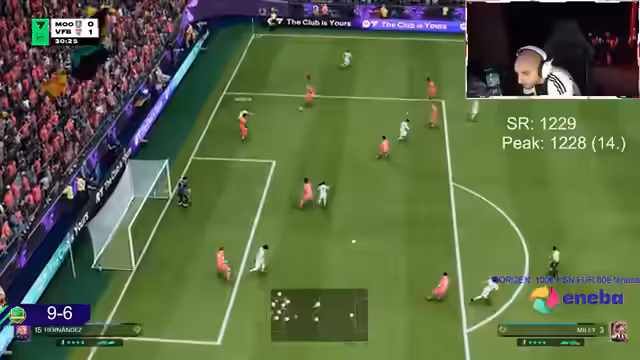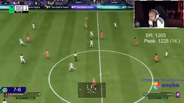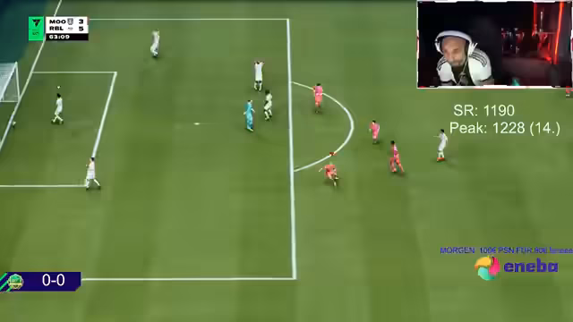 03:56:10Das Spiel beginnt mit einer ungewöhnlichen Konstellation und einem Schuss des Gegners, der jedoch durch Abseits abgewehrt wird. Der Streamer äußert den Wunsch, den Spieler Stum ins Team zu holen, da dieser als der beste gilt, entscheidet sich jedoch dagegen, um 500.000 Coins zu sparen. Er kritisiert die Verteidigungsarbeit seines Teams als die schlechteste, die er je gesehen hat, und bemerkt die Dominanz des Gegners Dullen in bestimmten Spielmomenten.
