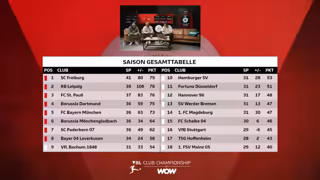 01:51:56Nach den Analysen der abgeschlossenen Spiele wird auf die verbleibenden wichtigen Partien geschaut. Freiburd besiegt Düsseldorf deutlich mit 5:1, was die Hoffnungen der Düsseldorfer auf die Top 8 zunichtemacht. Es wird auf das Fernduell zwischen Leverkusen und Magdeburg geblickt, das für den Kampf um die Top 8 von entscheidender Bedeutung ist. Der Streamer resümiert den Spieltag und gibt einen Ausblick auf die verbleibenden Spiele des letzten Spieltags, der die endgültige Qualifikation für den Showdown in Stuttgart klären wird.