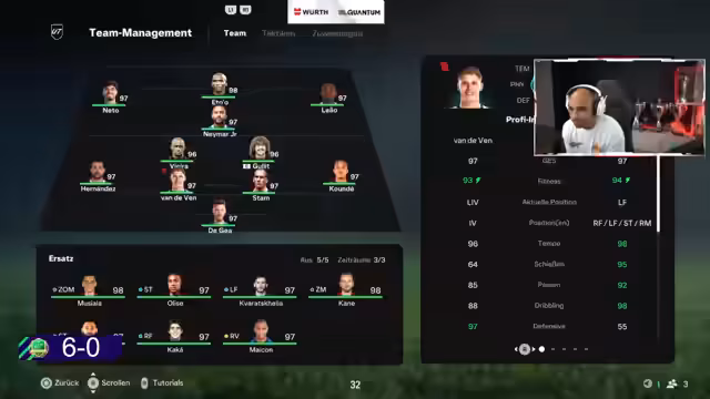 00:02:11Der Stream beginnt mit einerMorningroutine zum Wochenende. Der Streamer spielt die Weekend League (WL) und startet direkt in ein Spiel. Er erwähnt sein Team und aktuelle Spieler wie Cristiano Ronaldo, Neymar, Musialer und andere. Er nutzt die Formation 4-2-1-3 und wechselt später zu 4-2-1-3. Der Streamer ist motiviert und will eine gute Leistung in der WL abliefern. Er beschreibt auch seine Erfahrungen mit der Benutzeroberfläche und dem Gameplay.