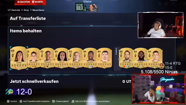 00:04:32Der Stream beginnt mit dem Aufbau eines neuen FIFA-Squads. Es wird über teure Spieler wie die Anis, die angeblich die Beste der Welt ist, diskutiert. Die Auswahl des Teams gestaltet sich schwierig, da viele potenzielle Spieler sehr hohe Kosten verursachen. Nach dem Kauf der ersten Spieler wird festgestellt, dass die Chemie im Team nur bei 72 liegt und mehrere Spieler keine festen Rollen haben, was die Spielstrategie erheblich erschwert und für das bevorstehende 15-0 Ziel problematisch ist.