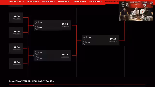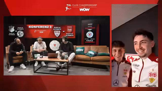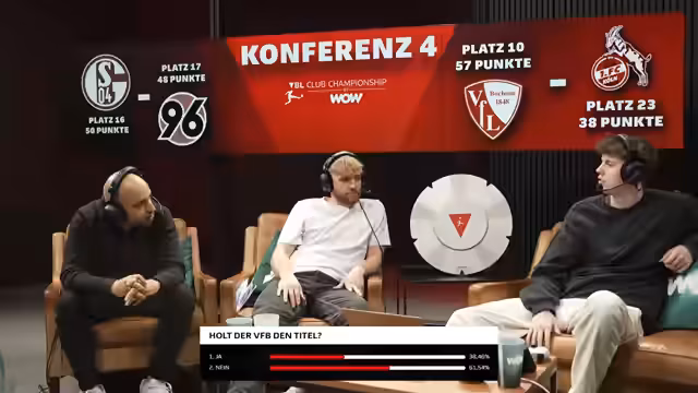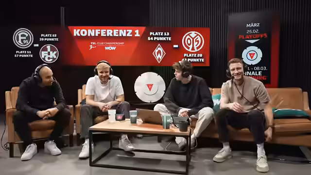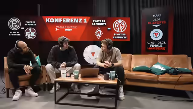 00:09:04Der Stream startet mit der Eröffnung der VW Club Championship Playoffs bei WOW. Es geht um die letzten acht Plätze für das große Finale in Hamburg, wobei jedes Spiel ein K.O.-Duell ist. Moauba begrüßt seine Co-Moderatoren Keanu und Richard und stellt den_formatspezifischen Druck der Playoffs gegenüber der regulären Saison heraus. Zudem wird die Gesamttabelle vorgestellt, die die Paarungen bestimmt, wobei das topgesetzte Team SC Freiburg den schlechtesten Gegner erhält.