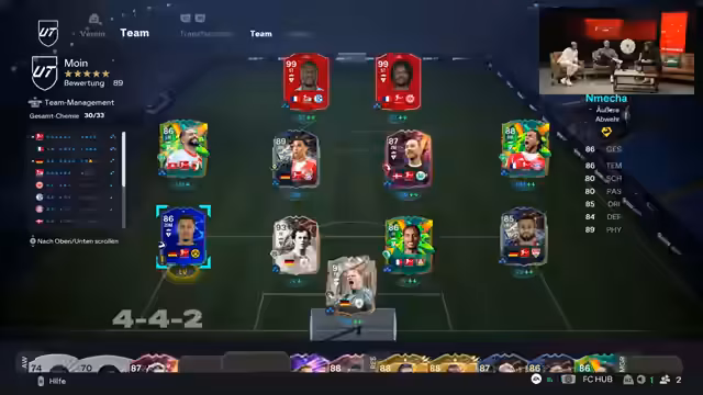 00:15:07Nassada wird als Freiburg-Spieler thematisiert, der am Donnerstag eine ungewöhnliche Formation (4-4-1-1) spielte, was zu Schwierigkeiten führte. Mo Orba bestätigt, intensiv mit Nassada kommuniziert zu haben, da dieser verzweifelt war über seine Leistungen mit nur 22% Ballbesitz im 4-4-2. Die Debatte dreht sich um die Vor- und Nachteile der Formationen: Das 4-4-2 ist offensiv stark, aber defensiv wacklig, während 4-4-1-1 stabiler ist, aber weniger Tore erzeugt. Der Streamer merkt an, dass Nassada trotz der Probleme in der Pro-Leader-Statistik wieder auf 4-4-2 gesetzt hat, um seine Erfolgsquote zu maximieren, und lobt dessen Bereitschaft, sich bei erfahrenen Spielern wie Mo Rat zu holen.