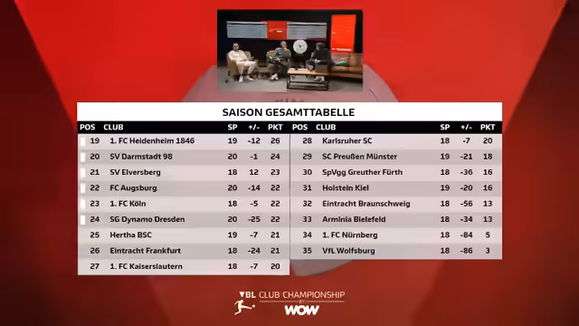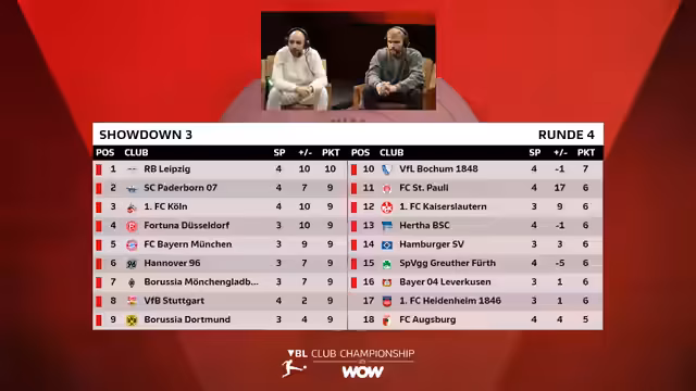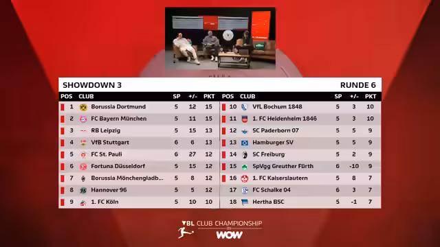 02:02:40Die aktuelle Tabellenlage für die VBL-Showdowns wird detailliert besprochen. Teams wie Paderborn, Köln und Hertha stehen bei 9 Punkten und kämpfen um die Top 16. Die Moderatoren analysieren, welche Spiele noch ausstehen und wie sich die Positionen durch Siege oder Niederlagen ändern könnten. Es wird deutlich, dass selbst 10 Punkte nicht ausreichen könnten und dass jedes Tor und Spiel entscheidend für die Gesamttabelle ist.