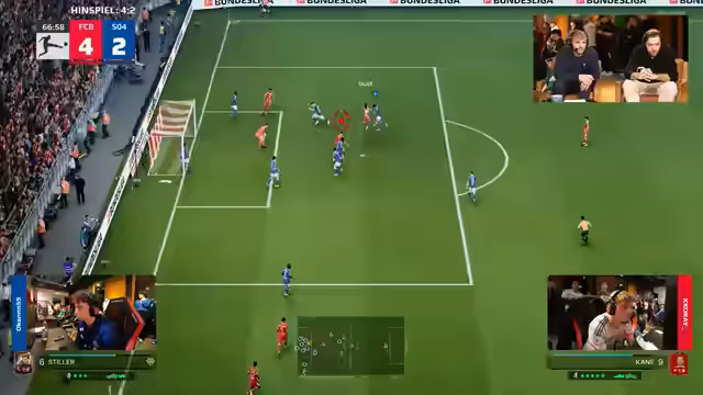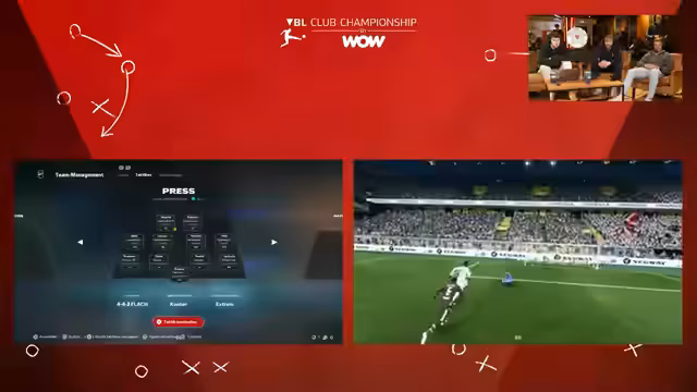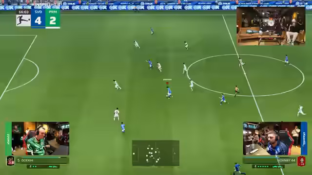 04:08:06Die Kommentatoren diskutieren über Taktikänderungen im Spiel. Julius gibt zu, dass er selten seine Taktik ändert, auch nicht die Tiefe. Es wird über das Einklemmen des Controllers bei Rückständen gesprochen, wobei Julius bei drei Toren Rückstand gegen einen starken Gegner aufgeben würde. Darmstadt führt insgesamt mit einem Tor, und Doki zeigt eine starke Leistung. Ein Konter von Berkay wird abgewehrt, und Doki verteidigt bockstark. Kurz vor der Halbzeit erzielt Berkay ein wichtiges Tor, was zu einer Diskussion über die „45. Schwitz-Minute“ führt. Das Spiel in Darmstadt geht in die Halbzeit, und die Kommentatoren wechseln zum Spiel in Dortmund. Dort sind zwei weitere Tore gefallen, und es steht insgesamt 6:0 für Dortmund, was als Machtdemonstration bezeichnet wird. Dortmund hat von der ersten Minute an dominiert und ist verdient im Halbfinale. Auch Bayern und Magdeburg haben hoch gewonnen und sind im Halbfinale. Das Spiel in Darmstadt ist das einzige noch spannende Spiel. Olli Kahn wird für seine Leistung gelobt, obwohl die Kommentatoren seine Karte kritisch sehen. Maxi Bayer wird als „Gamechanger-Playstyle“ und „cheap beast“ gelobt. Das Spiel in Dortmund steht 2:0 zur Halbzeit. Berkay erzielt einen weiteren Treffer nach einer Player-Lock-Ecke. Die Kommentatoren wechseln zurück nach Dortmund, wo De Ninho alles im Griff hat und die Führung kontrolliert. Dortmund hat in 142 Minuten kein Gegentor kassiert, was die Kommentatoren als Wahnsinn empfinden. Das Spiel in Darmstadt ist ein offener Schlagabtausch mit fünf Toren nach 23 Minuten, und Doki führt erneut. Berkay meldet eine Pause an und stellt seine Taktik um.