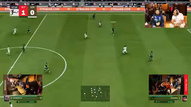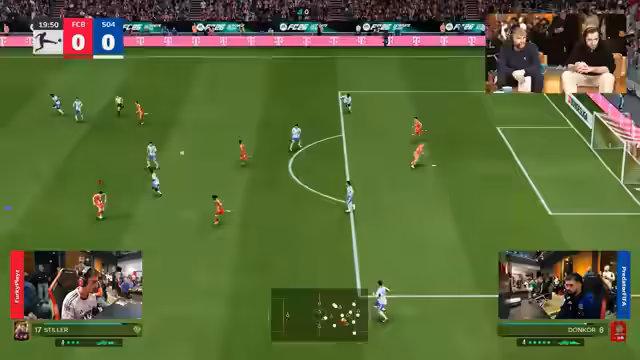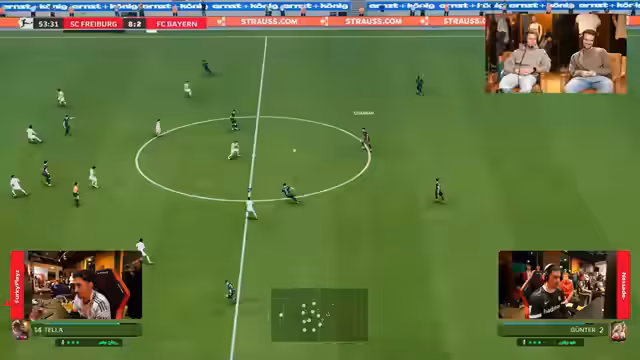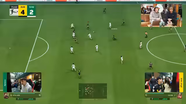 03:28:04Die Kommentatoren zeigen sich beeindruckt von der Aktivität des Chats und der Diskussion über das Einklemmen des Controllers bei Niederlagen. Es wird ein Platzwechsel vorgenommen, wobei der neue Platz als „Premiumplatz“ beschrieben wird, da er eine bessere Sicht bietet. Die Aufmerksamkeit richtet sich auf die laufenden Spiele. Virgil wird als der beste Spieler der VBL gelobt, der in den letzten zehn Spielen alle gewonnen hat, auch gegen Top-Spieler wie Umut und Lukasovic. Es wird die Prognose aufgestellt, dass Virgil sein Einzelspiel gewinnen wird, wobei die Höhe des Sieges noch offen ist. Sein Spielstil, ein 4-5-1, wird als typisch italienisch und schwer zu besiegen beschrieben. Parallel dazu wird das Spiel zwischen Nasada und Furky beleuchtet, in dem Nasada früh mit 1:0 für Freiburg in Führung geht. Es wird erwartet, dass in diesem Spiel viele Tore fallen, da beide Teams sehr offensivstark sind. Ein Tor auf dem anderen Platz wird angekündigt, wo Virgil zum 1:0 für Bayern trifft und seiner Favoritenrolle gerecht wird. Die Kommentatoren betonen, dass Virgil das Spiel kontrolliert, während Yannick das Tempo stark herausnimmt.