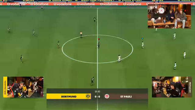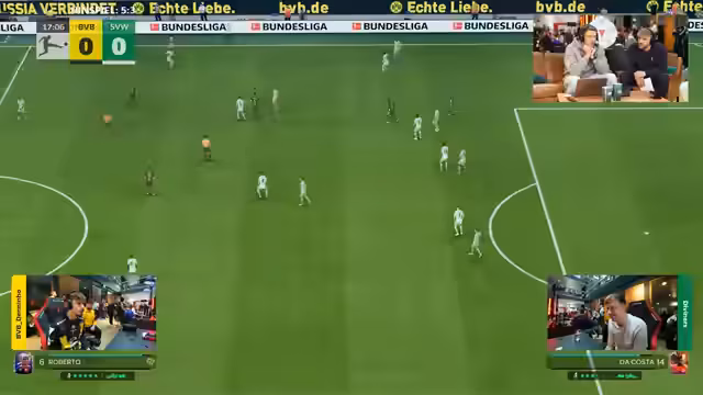 06:14:57Das Spiel startet mit dem BVB in schwarz-gelben Trikots gegen St. Pauli in weißen Trikots, wobei Dortmund von links nach rechts spielt. Berkay von St. Pauli erobert schnell den Ball und leitet einen Angriff ein, der jedoch von Nino verhindert wird. Kurz darauf erzielt C-Roberto ein spektakuläres Tor zum 3:0, dessen Entstehung für Verblüffung sorgt und als außergewöhnlich beschrieben wird, da der Passweg und die Ausführung untypisch erscheinen. Das frühe 1:0 für Nino und den BVB wird schnell durch einen Flachschuss von Hutongi zum 1:1 ausgeglichen, was auf ein sehr unterhaltsames und torreiches Spiel hindeutet. Die Experten diskutieren über die Effektivität von Flachschüssen und die Schwierigkeit, diese zu verteidigen.