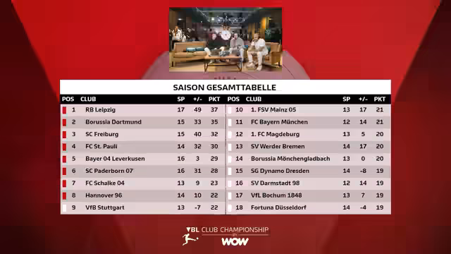 00:17:00WOW wird als Naming-Right-Partner vorgestellt. Zuschauer haben die Möglichkeit, eine WOW-Geschenkkarte zu gewinnen, indem sie später im Tippspiel gegen die Hosts antreten. Darüber hinaus werden im Rahmen des Showdown-Finales zwei Bundesliga-Tickets verlost, die für Spiele des Lieblingsvereins in der 1. oder 2. Bundesliga genutzt werden können. WOW wird als bester Ort für Live-Sport beworben, da dort alle Bundesliga-Spiele am Freitag und Samstag, alle Spiele der 2. Bundesliga sowie die nächsten Runden des DFB-Pokals zu sehen sind. Mo Auber erwähnt, dass sein Verein Bochum noch im DFB-Pokal vertreten ist und gegen Stuttgart spielen wird.