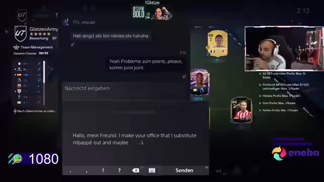01:10:28Es wird festgestellt, dass sich das Spiel trotz der kurzen Zeit seit dem Release wie drei Monate anfühlt. Glückwünsche gehen an Düsseldorf für den Sieg gegen Bochum. Es wird die geistige Anstrengung durch den Text hervorgehoben und als das schlechteste bis jetzt bezeichnet. Die Häufigkeit von Pina im Sturm wird kritisiert. Es wird über die Schwierigkeit gesprochen, im Matchday-Modus weit zu kommen und die Qualität anderer Spieler anerkannt. Eine Win-Serie wird angestrebt, aber das Gameplay wird als schlafbedürftig wahrgenommen. Es wird über die Kaputtheit des Spiels geklagt, insbesondere bei Freischüssen, Ecken und Abschüssen. Das Spiel mit Aytana wird als schlecht empfunden.
