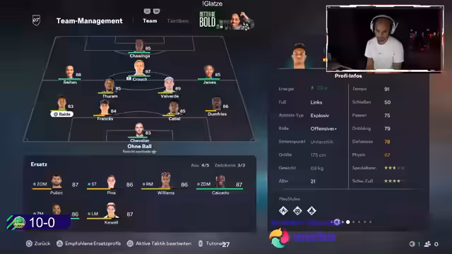 06:21:05Der Spieler gibt Tipps für Streamer, wie man mehr Zuschauer bekommt, indem man verschiedene Browser und Handys nutzt, um die eigene Zuschauerzahl zu erhöhen. Er betont, dass dies kein Bot ist, sondern eine Möglichkeit, in der Liste weiter oben zu erscheinen. Er erwähnt, dass ein Kollege von ihm dies gemacht hat und dadurch mehr Zuschauer gewonnen hat. Er ist frustriert über Schmerzen, die er beim Spielen hat. Er lobt einen guten Start ins Spiel und Peter Crouch. Er ist frustriert über die Verteidigung des Gegners und beklagt, dass seine Sechser so gut in der Mitte stehen. Er ist nervös, wenn der Gegner vor dem Start drückt und er 250.000 Coins verlieren könnte. Er beklagt, dass die 4-5-1 Formation schlecht ist, obwohl er immer gewinnt, weil die Gegner den Ball verlieren und hinten bleiben. Er findet die Formation nervig und offensiv 'tot'. Er hat noch nie gegen diese Formation verloren, aber sie ist im Hype. Er spielt gegen einen Pro-Spieler und merkt das direkt. Peter Crouch spielt maximal eine Halbzeit.