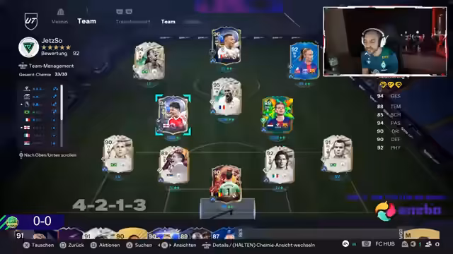 00:04:09Der Stream beginnt mit der Vorbereitung auf die Weekend League und dem Testen der TOTY-Version von Kylian Mbappé. Nach einem kurzen Gruß wird direkt in die Taktik übergegangen, speziell für die Formation 4-2-1-3. Es werden erste Spielerbewertungen vorgenommen, darunter Declan Rice, der als Schnittstellenpass-gold bewertet wird. Die Diskussion dreht sich um mögliche Aufstellungen und die Einbindung von Spielern wie Ronaldinho und Pedri, wobei betont wird, dass Mbappé das Highlight des Teams ist.